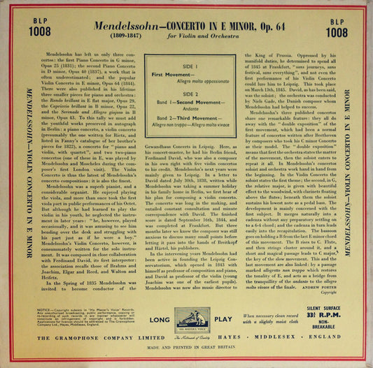 Felix Mendelssohn-Bartholdy - Gioconda De Vito And London Symphony Orchestra, The Conducted By Sir Malcolm Sargent - Violin Concerto In E Minor (LP,10",Mono) (Very Good Plus (VG+))