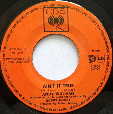 Andy Williams - Ain't It True / Loved One (7", Single) (Very Good Plus (VG+))