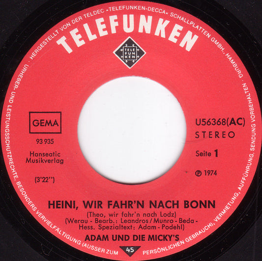 Adam Und Die Micky's - Heini, Wir Fahr'n Nach Bonn (Theo, Wir Fahr'n Nach Lodz) (7",45 RPM,Single) (Very Good Plus (VG+))
